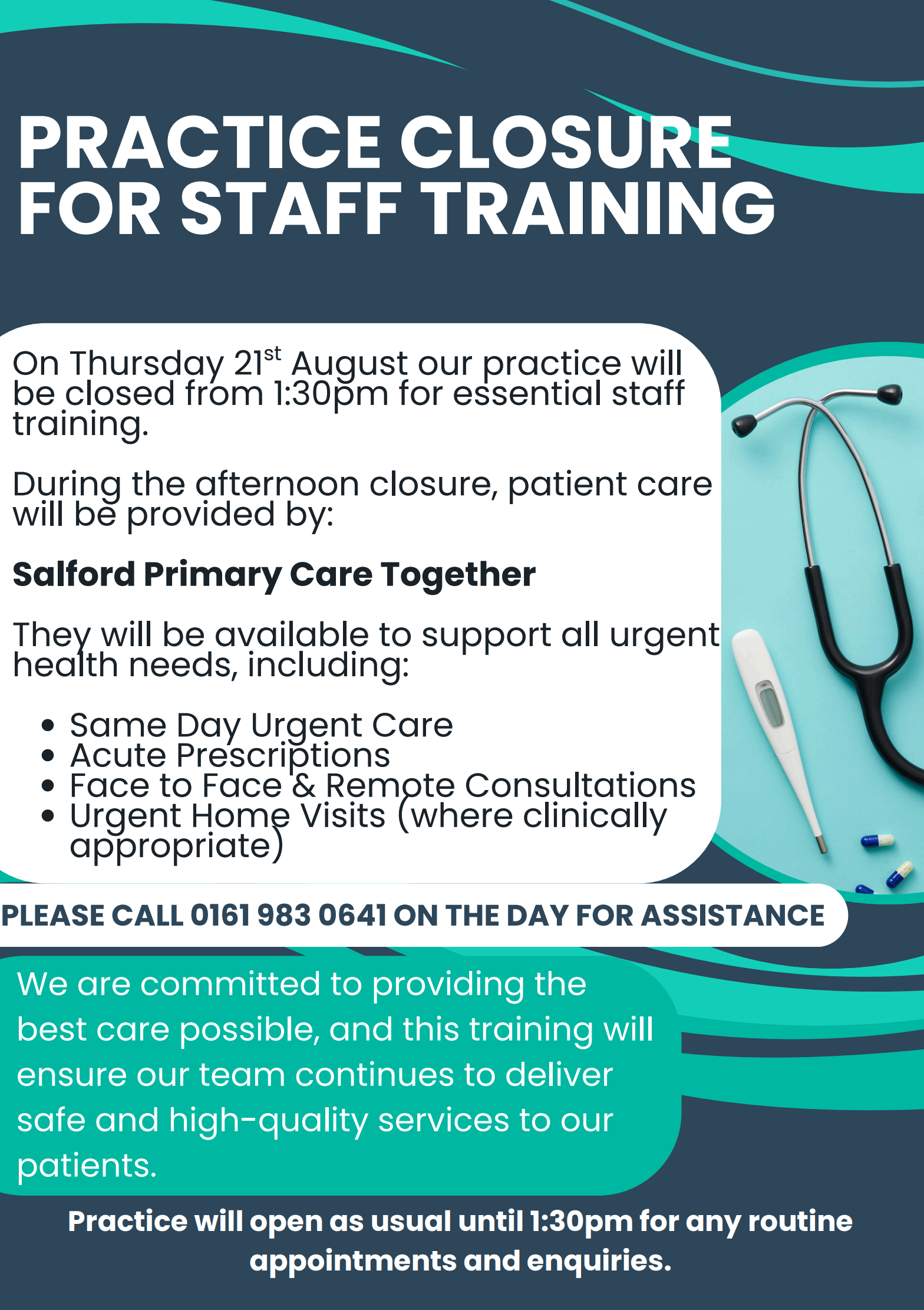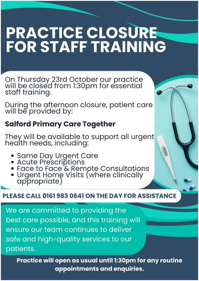 Home Page Ellenbrook SurgeryWelcome to our new surgery website – we hope you find it useful You and Your General Practice Christmas Opening Hours AppointmentsInformation Repeat Prescriptions Register as a New Patient Get a Sick (Fit) Note Get Test Results Update your Contact Details Practice Information Health Information Register for Online Services Latest News Open Morning 19th December 2025read more about Open Morning Practice Closure For Staff Training 9th December 2025read more about Practice Closure For Staff Training Practice Closure For Staff Training 21st November 2025read more about Practice Closure For Staff Training Next : View older posts Subscribe to our Latest News! Email address Patient Feedback