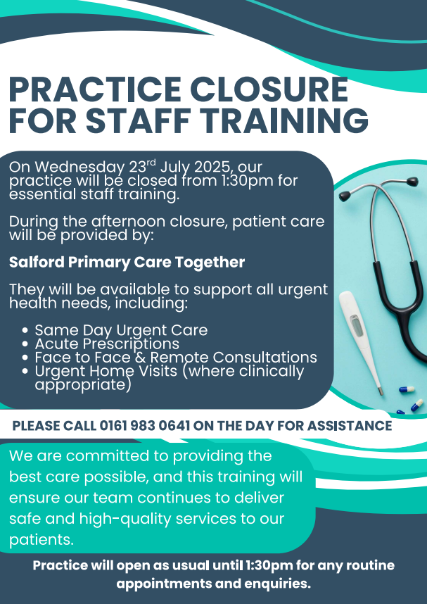 Home Page Ellenbrook SurgeryWelcome to our new surgery website – we hope you find it useful You and Your General Practice Christmas Opening Hours AppointmentsInformation Repeat Prescriptions Register as a New Patient Get a Sick (Fit) Note Get Test Results Update your Contact Details Practice Information Health Information Register for Online Services Latest News Open Morning 19th December 2025read more about Open Morning Practice Closure For Staff Training 9th December 2025read more about Practice Closure For Staff Training Practice Closure For Staff Training 21st November 2025read more about Practice Closure For Staff Training Next : View older posts Subscribe to our Latest News! Email address Patient Feedback