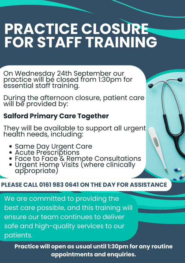 Home Page Ellenbrook SurgeryWelcome to our new surgery website – we hope you find it useful You and Your General Practice Christmas Opening Hours AppointmentsInformation Repeat Prescriptions Register as a New Patient Get a Sick (Fit) Note Get Test Results Update your Contact Details Practice Information Health Information Register for Online Services Latest News Open Morning 19th December 2025read more about Open Morning Practice Closure For Staff Training 9th December 2025read more about Practice Closure For Staff Training Practice Closure For Staff Training 21st November 2025read more about Practice Closure For Staff Training Next : View older posts Subscribe to our Latest News! Email address Patient Feedback